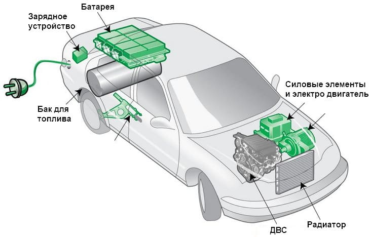 - HEV (Hybrid Electric Vehicle) — классический гибрид, где батарея заряжается от ДВС.